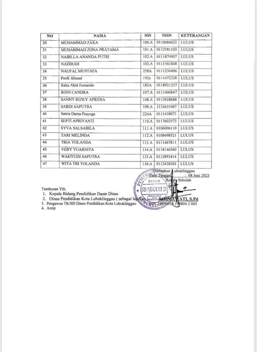 PENGUMUMAN KELULUSAN SD NEGERI 20 LUBUK LINGGAU TAHUN AJARAN 2022/2023